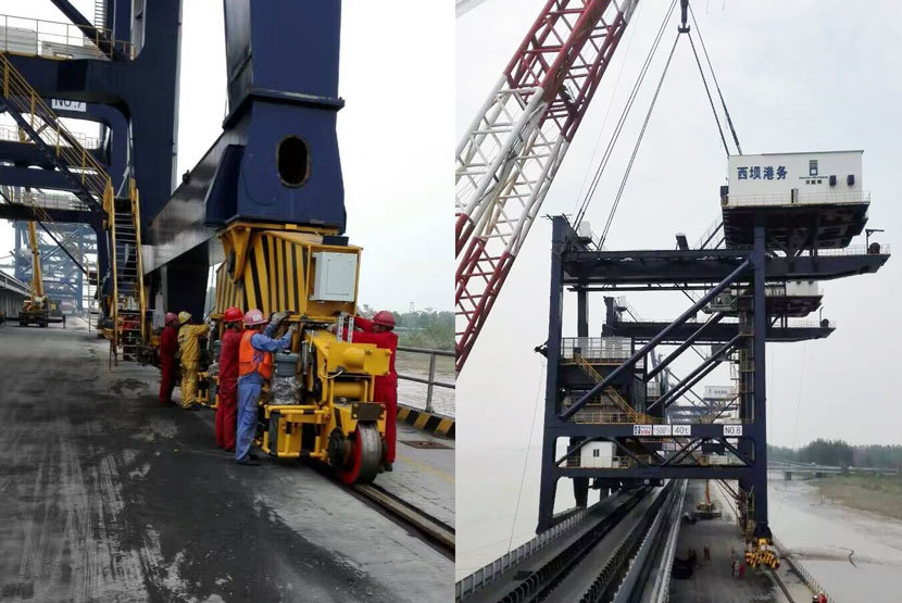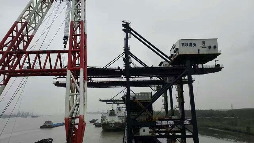 本次兩臺卸船機(7#機、8#機)于2016年9月中旬在張家港制造基地整機安裝結束后,于9月17日開始滾裝,并分別于9月19日,9月20日滾裝上船,加固海固件;9月21日具備發(fā)運條件并出港; 9月22日晚搭載卸船機的駁船“匯宗海”安全抵達西壩碼頭;9月24日和25日,卸船機正式吊裝上岸并順利入軌;吊裝小門架和安裝前大梁,標志著本次滾裝、運輸、吊裝工程全部順利完成。7#機、8#機是華新機電與南京西壩共同自主研發(fā)的第二套在線料斗稱重卸船機,歷時半年時間制造完成,技術國際領先,制造工藝先進,生產工期高效。