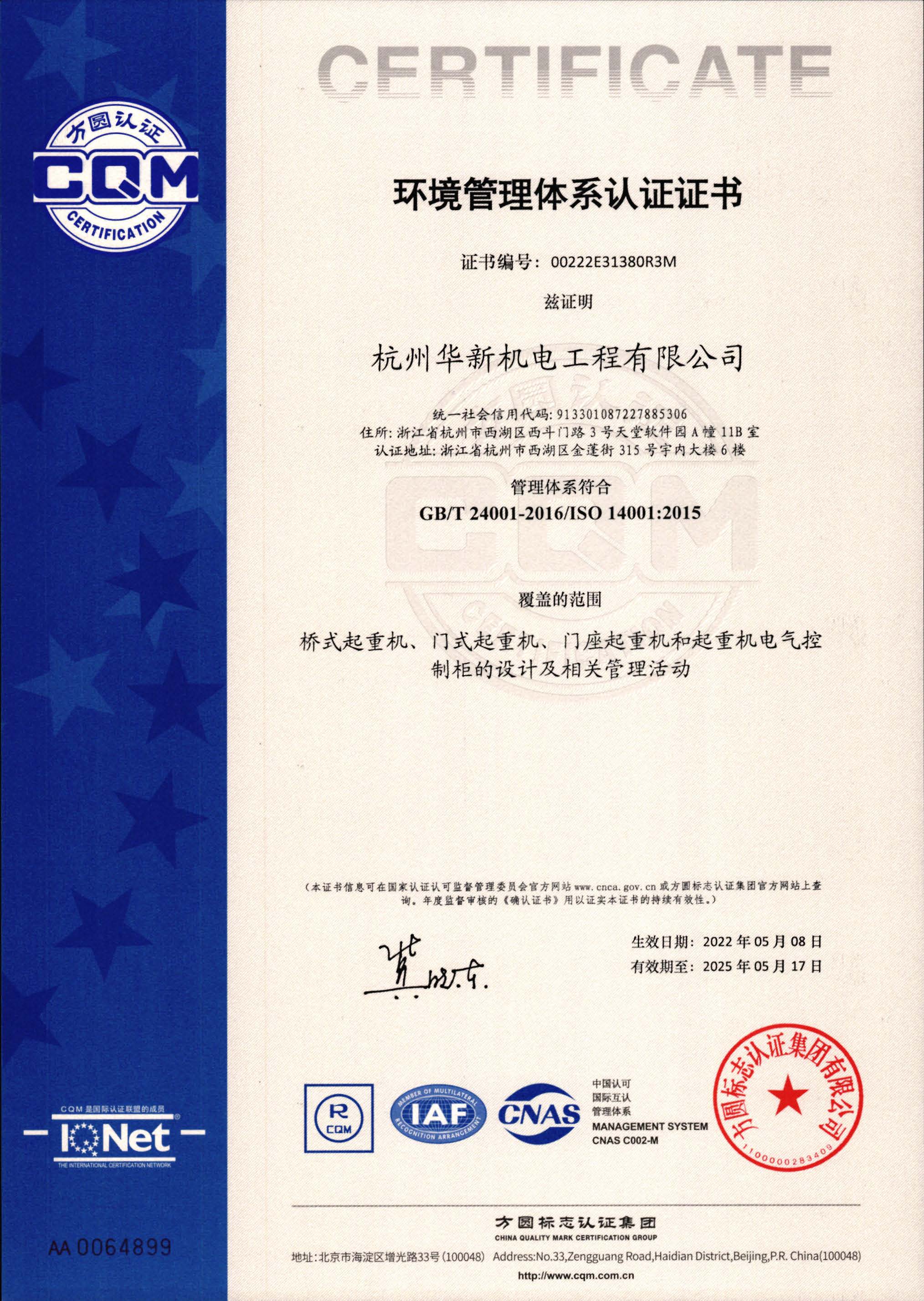 環(huán)境管理體系認(rèn)證證書