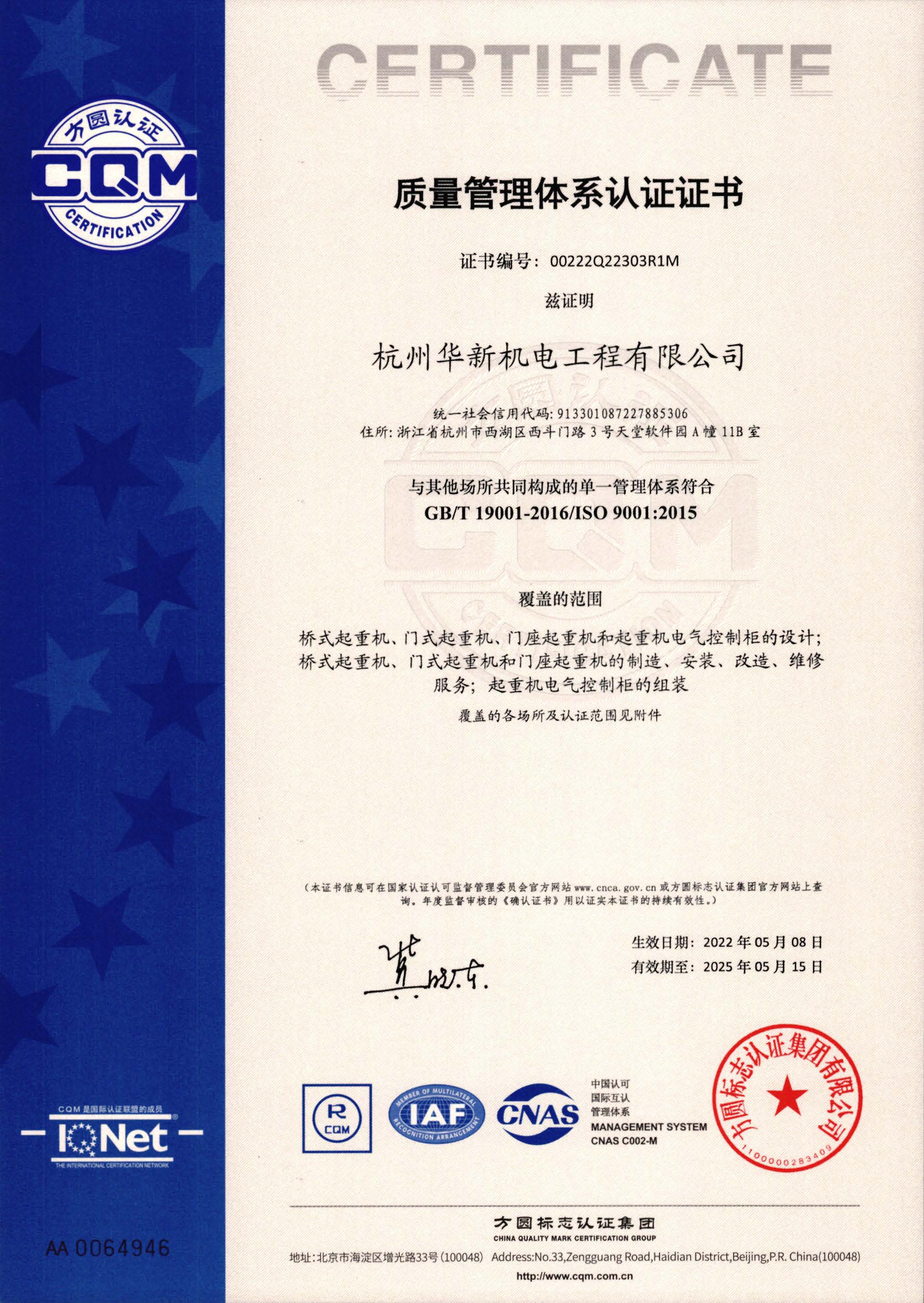 質(zhì)量管理體系證書
